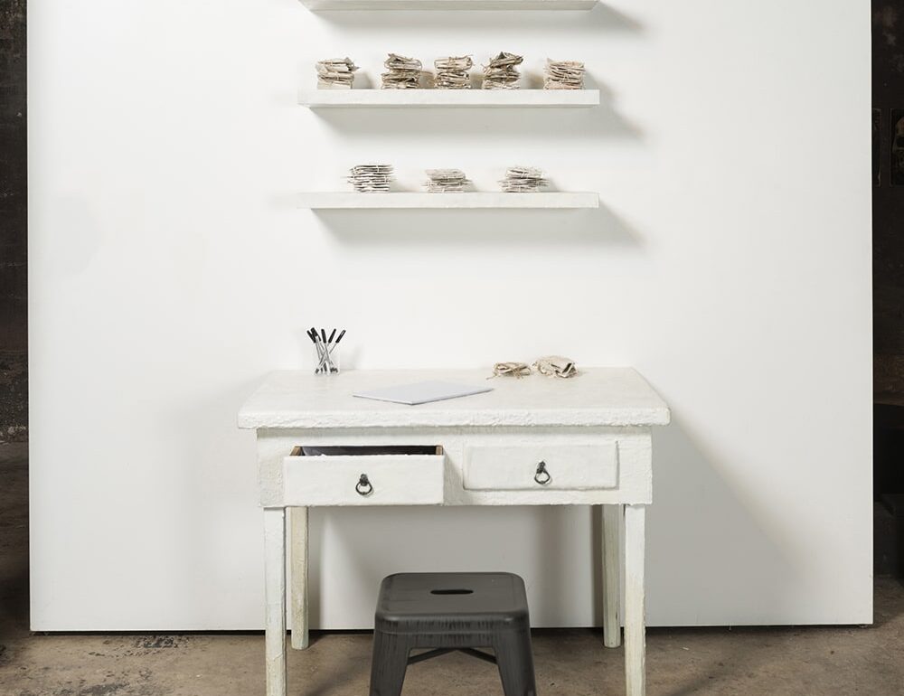 Rose Rigley’s I wrote a letter to my love and on the way I dropped it is an interactive installation that invites viewers to sit at a desk to sort through and contribute letters to lost loves. One desk drawer contains letters that can be opened and read, the other, sealed letters not to be opened. Whether intended for romantic loves lost, or familial loved ones no longer alive, the work seeks to find patterns in the way we deal with loss and to gain a greater understanding of what it means to lose–either by death or by circumstance–the presence of those whom we love and who loved us.