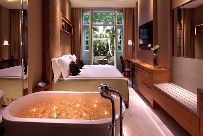 Here’s a fun fact: The Club uses luxury handmade beds by Hypnos, a Royal Warrant holder, which basically means that it has the endorsement of the Queen of England. Therefore, a comfortable and romantic night at this intimate hotel along Ann Siang is pretty much guaranteed. Awesome naps aside, your stay will be made better by a complimentary bottle of Laurent Perrier Brut, a three-course dinner at on-site The Disgruntled Brasserie, and a marvellous floral bouquet like you’ve never seen. Even if you go overboard with the alcohol at the trendy bars in the area, never fear; The Club is including breakfast for two and a late checkout at 2pm.