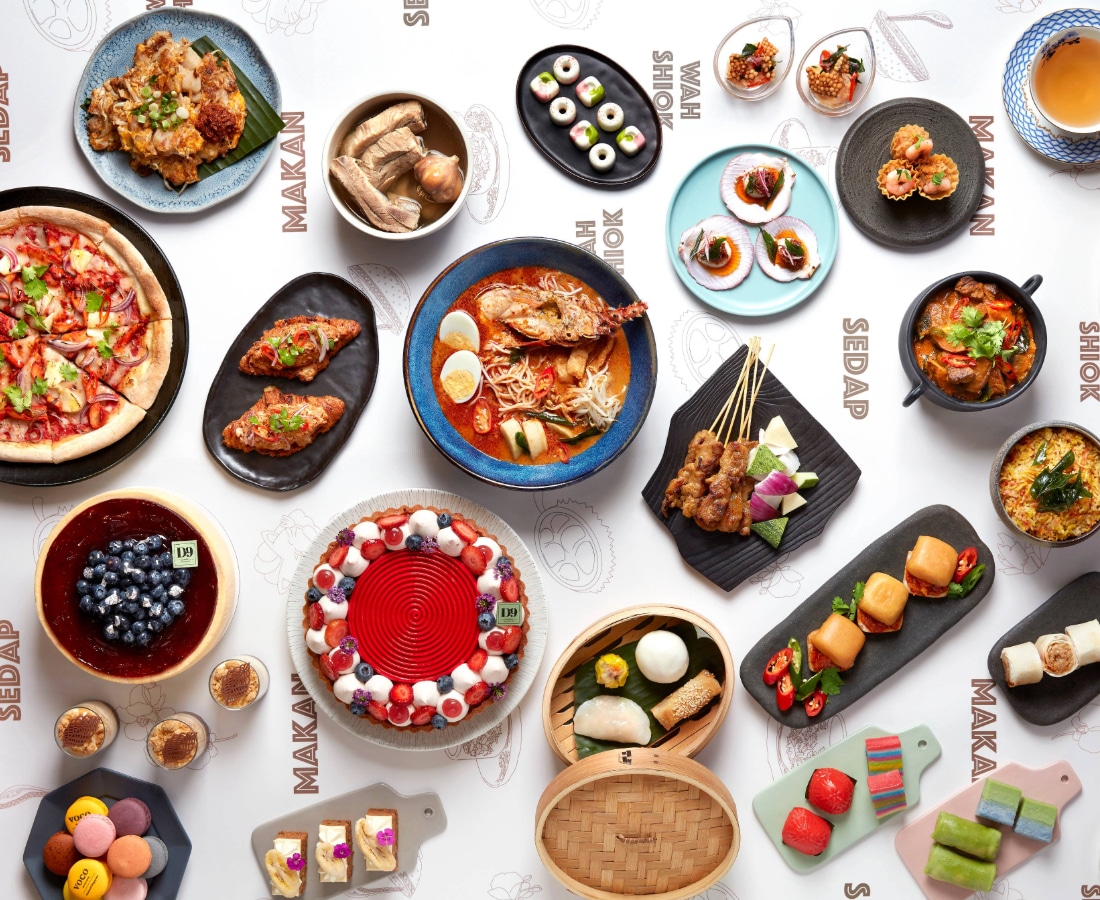 Dig into eight curated stations, including a Salad Bar, a DIY live-action station serving freshly prepared popiah, kueh pie tee, XO fried carrot cake, and chicken satay. Classic Western favourites are also reimagined with local flavours, such as the Curry Beef Marmalade Slider and Sambal Seafood Pizza. Select one main course from a curated selection of elevated hawker-inspired dishes, such as the Singapore Laksa with rock lobster, Briyani with Mutton Curry, Three Treasure Beef Noodle Soup, or Bak Kut Teh. For sweets, feast on D9 Cakery specials such as the signature Blueberry Cheesecake, Summer Strawberry Verbena Tart, and Pandan Gula Melaka Pound Cake.