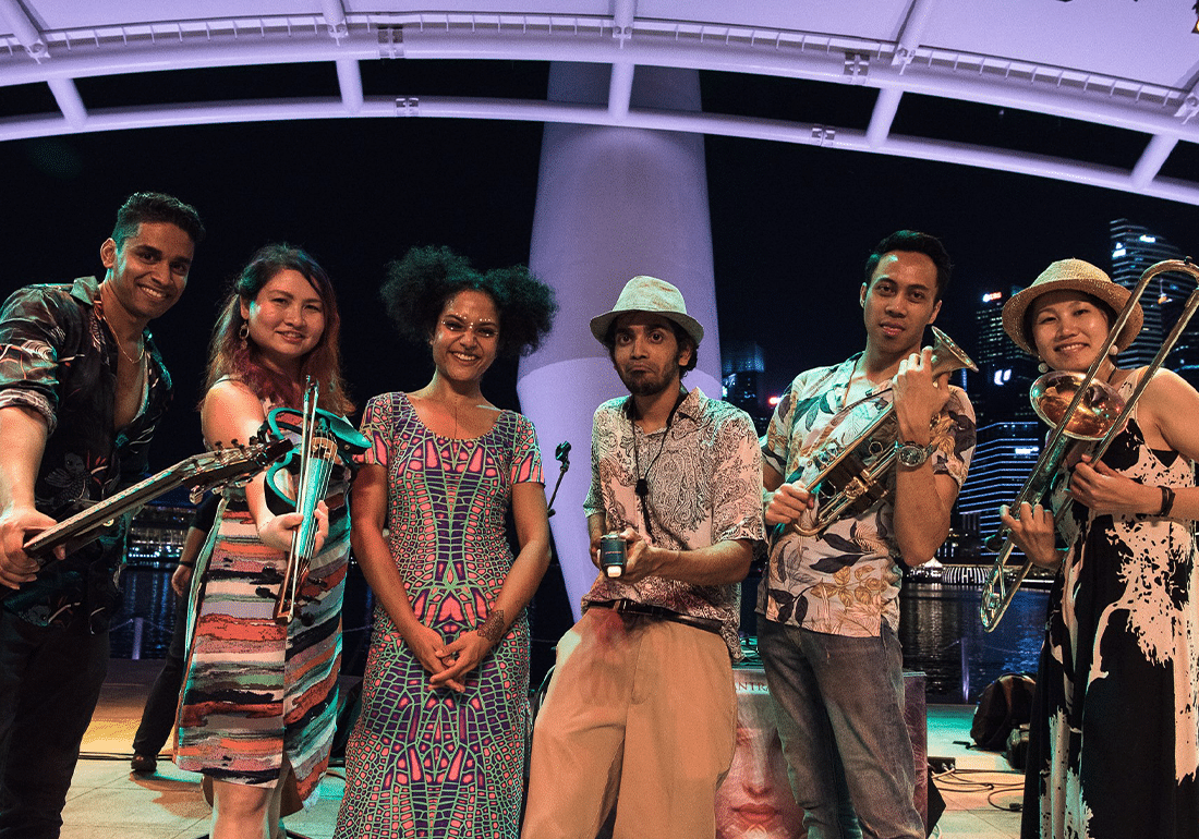 If there’s one word to describe the band Mantravine, it will most likely be “psychedelic musicians”. With their bohemian fashion style – consisting mostly of loud prints and tribal-inspired clothing – the members look like they came straight from the 1960s with their free-spirited vibes. And their music well reflects that. Since they’re back from New Zealand, we talk to Deborah (Singer), Karen (Violinist), Rupak (Music Producer), Isuru (Guitarist), and Eriko and Farhan (Trumpet) about the unique sounds they produce.