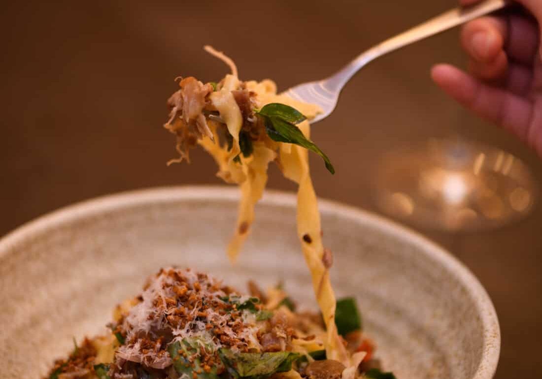 Chef Deborah has a knack for bold fusion plays, and the Pig’s Head Tagliatelle (S$28) is proof. Uncannily resembling mee pok, slightly soft tagliatelle is tossed with crispy, deep-fried bits of pig’s ears and other parts of the head. Finished off with a healthy dash of lime and chili, it’s at once familiar and radically fresh. And while it might seem like a whammy on the palate, our glass of Envínate Albahra Tinto 2018 (S$18/glass) stood up well to it with elegant cherry notes and soft tannins.