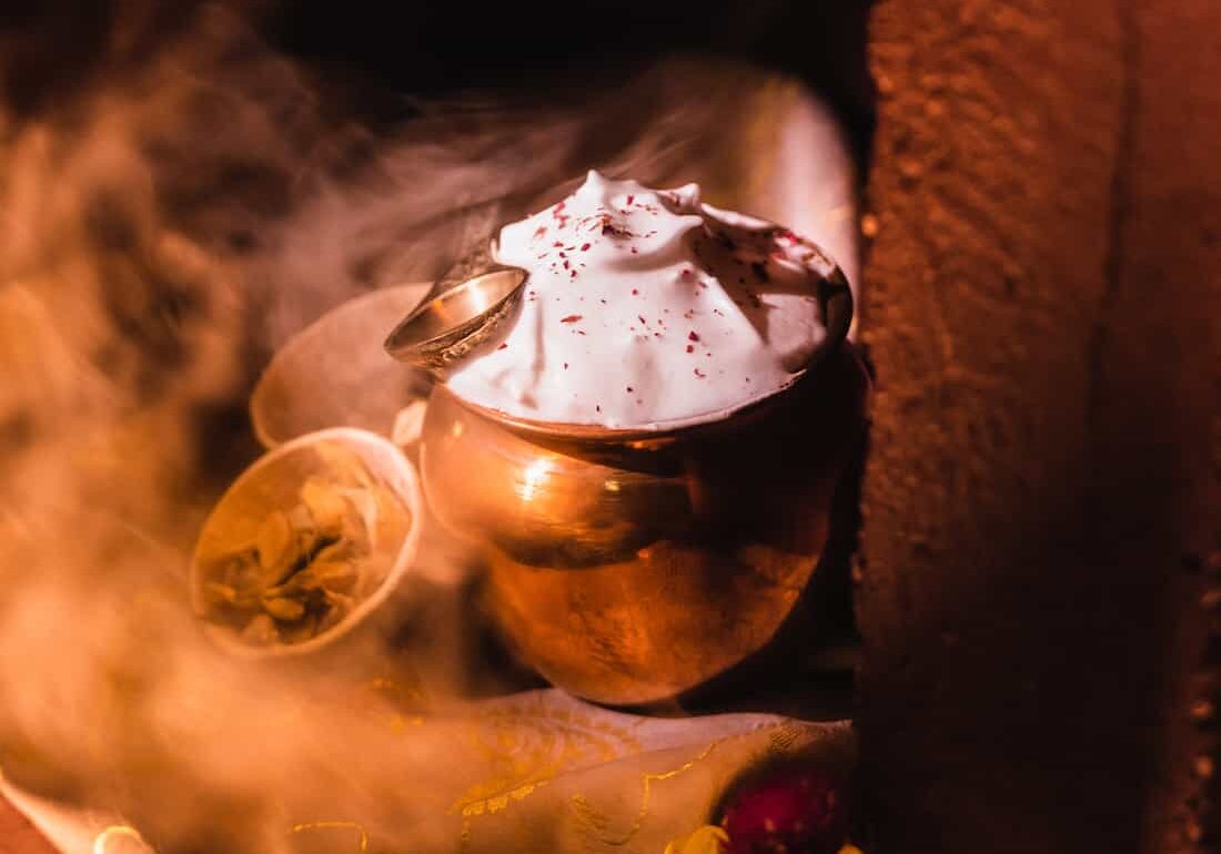The Indian A.F. is another one we’d highly recommend. This new-age version of a clarified milk punch with yoghurt, pistachio and saffron is made with Old Monk Rum. Thick on the tongue and smooth going down, it’s served in a lovely brass cup traditionally used in religious offerings. Nobody tell Yugi’s mother, she’ll be very upset.