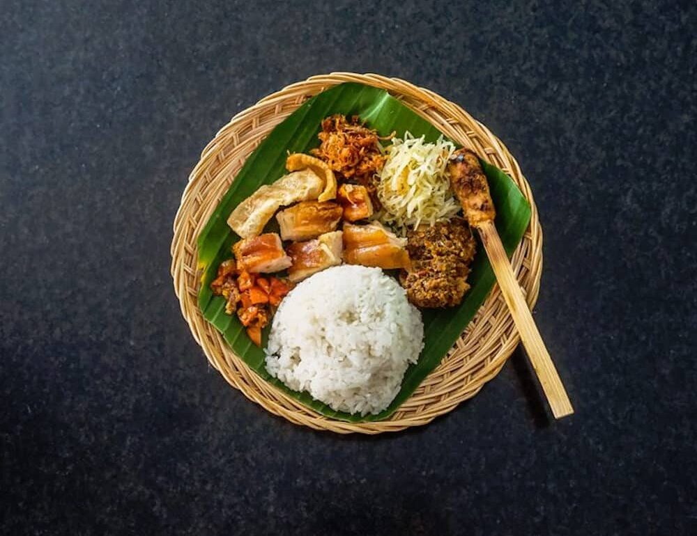 baThe most iconic dish of the Balinese culinary repertoire is probably babi guling. Traditionally a special food, served only at religious events like house blessings, weddings, and birthday ceremonies, it’s become an everyday food (we’re not complaining) due to its popularity amongst foreign visitors. The star of this dish is the suckling pig stuffed with seasoned cassava leaves before being grilled whole over a fire, and the slow cooking process results in tender and juicy meat and a crispy pork rind.