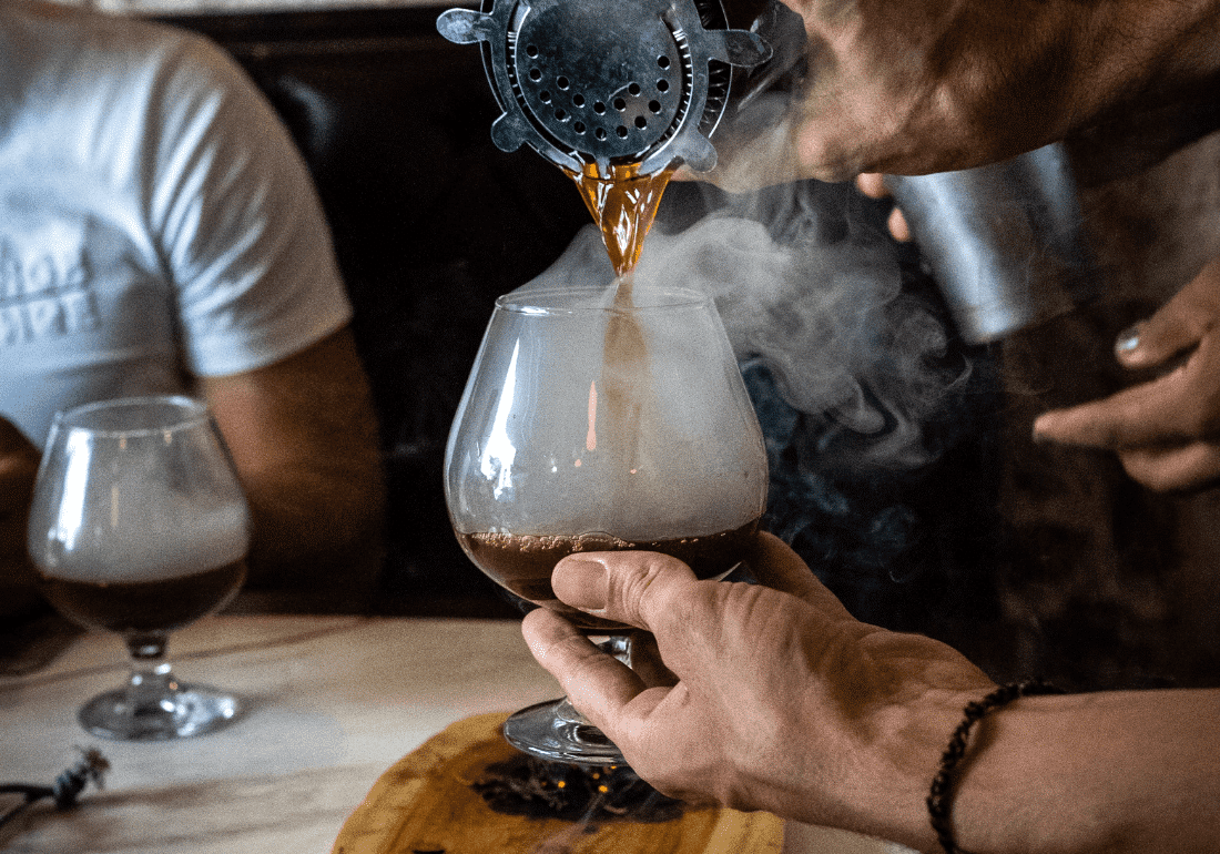 Inspired by a tobacco leaf-infused dessert Thomas Keller whipped up for a cigarette-craving Bourdain, Manhattan’s Cigarette Break (S$26++) pairs the smokiness of Bowmore 12 Year Whisky with the classic coffee notes in Luxardo Hazelnut & Espresso Liqueur. Adding egg white for texture and served with an edible toasted coconut cigarette, this homage is a fun one.