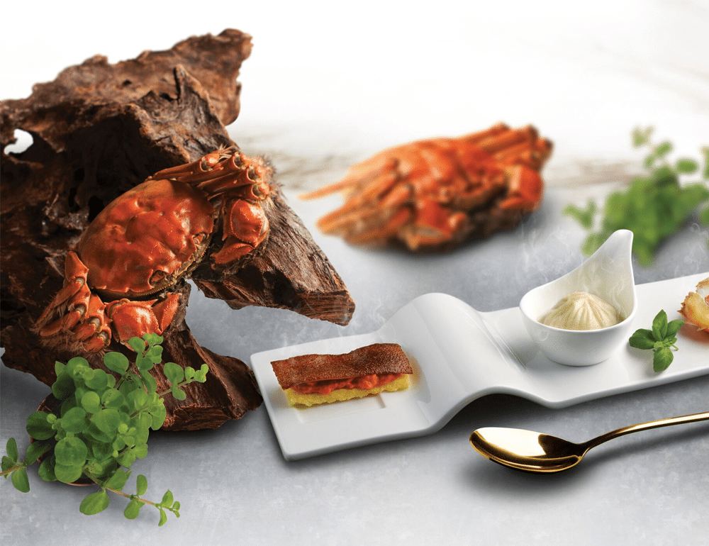 Szechuan Court sources its crabs from the pristine freshwaters of Yangcheng Lake in Jiangsu province. Here, Master Chef Mok Wan Lok delights with classic recipes and modern creations such as the signature Steamed Whole Hairy Crab with Shiso Leaf, cooked to preserve natural sweetness and aroma. For a more umami flavour, try the Stewed Hairy Crab with Aged Chinese Wine, alongside the heart-warming Chef’s Signature Superior Crabmeat Consommé. Dim sum lovers should enjoy the Hairy Crab Roe Scrambled Egg White Tarts, freshly baked and piping hot.