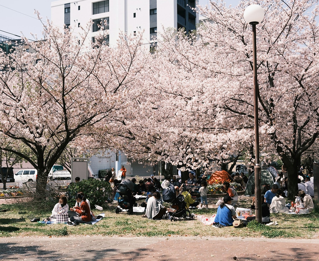 Hanami picnic under full-bloom cherry blossoms in a central Fukuoka park during spring season.