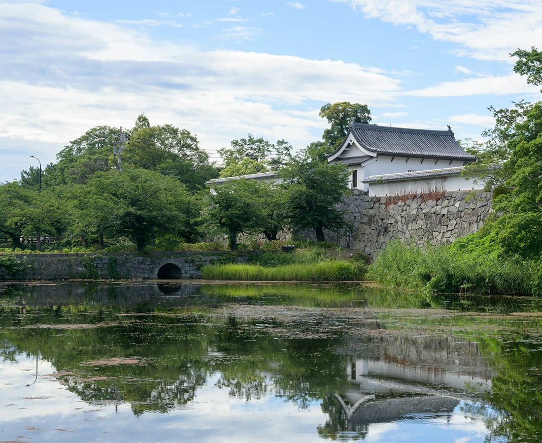 Serene view of Fukuoka Castle’s moat and stone walls surrounded by greenery and sky reflections.