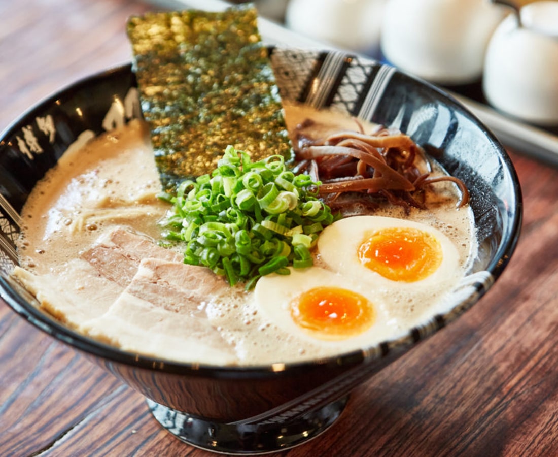 Rich bowl of Hakata Ramen with tonkotsu broth, soft-boiled eggs, and spring onions — Fukuoka’s iconic noodle dish.