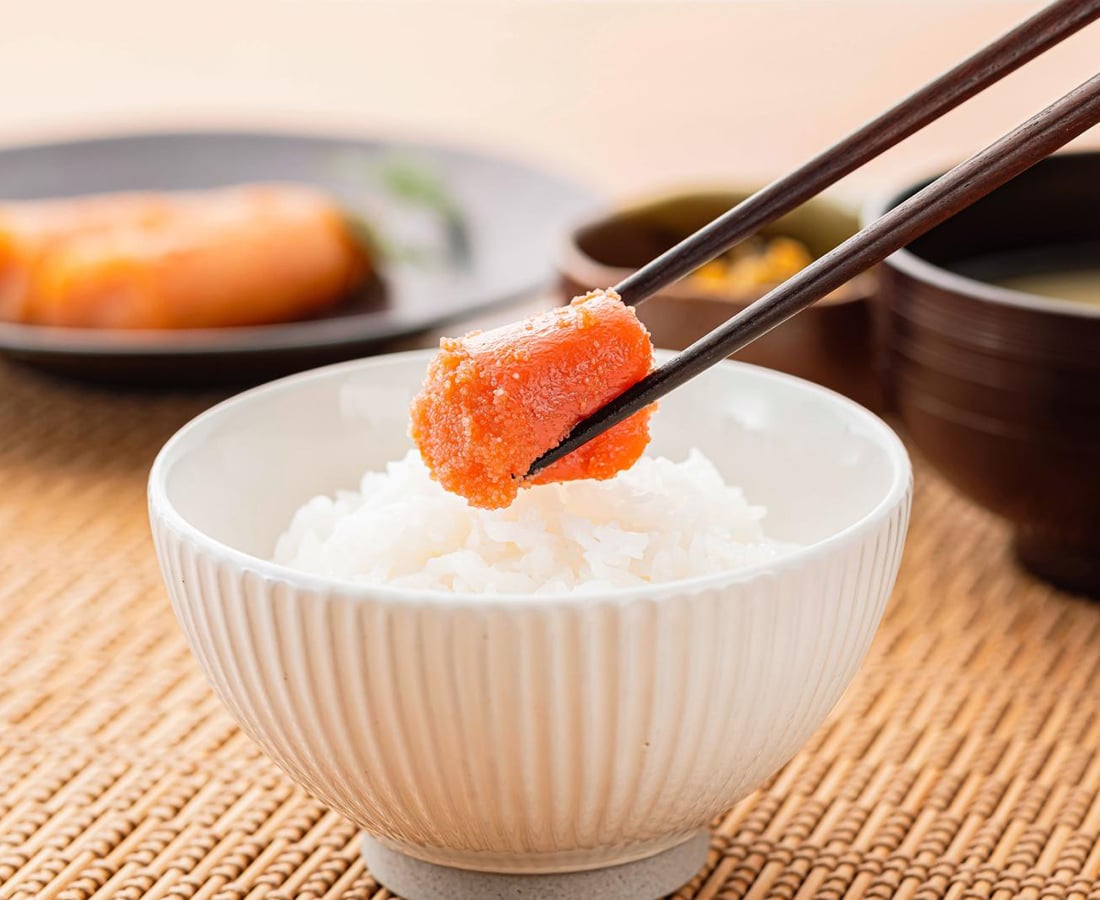 Close-up of Karashi Mentaiko served atop a bowl of white rice in Fukuoka, Japan’s beloved local delicacy.