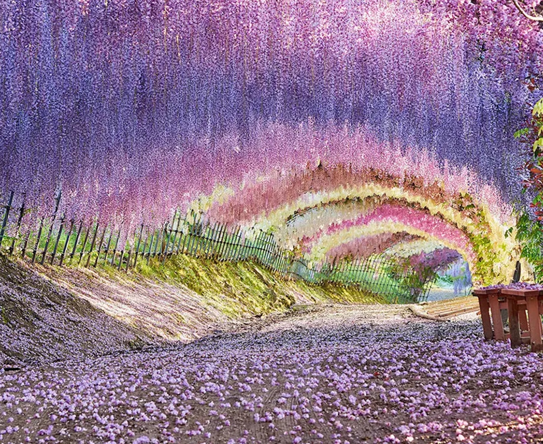 Dreamlike lavender tunnel in Kawachi Wisteria Garden — a seasonal highlight near Fukuoka City.