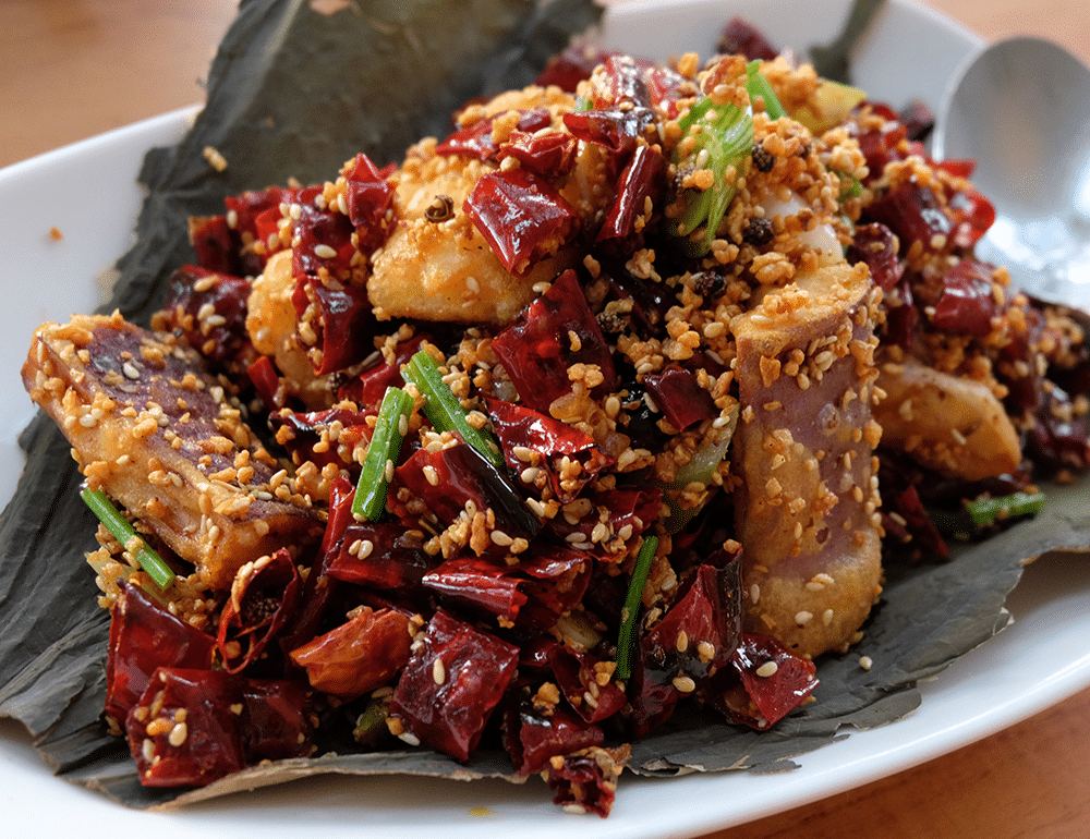 For starters, the Crispy Fried Salmon Skin with Salted Egg Yolk and Lime Zest ($14) is plain addictive, the zest’s acidity balancing out the saltiness of the egg yolk to make a flavourful crackling. Next, the overwhelmingly spicy Szechuan Style “La Zi” Spicy Egg Plant ($10). For someone who can’t handle a lot of piquancy, the tastiness of the creamy and slightly salty egg plants manages to squelch my pain receptors, for a little while at least.