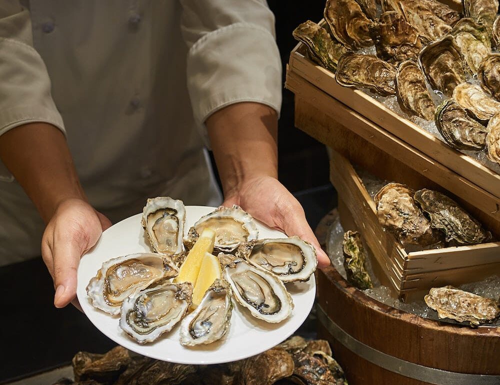 Fresh seafood on ice is always a good place to start; you’ll find chilled Alaskan king crab alongside fresh poached prawns, and various shellfish next to the sushi and sashimi section (think the big three – salmon, yellowtail, and tuna). You’ll find the French oysters from Normandy separately; said to be farmed sustainably, they have their own counter and staff – our oysters were shucked to order – along the main buffet line, so complete your seafood plate there.