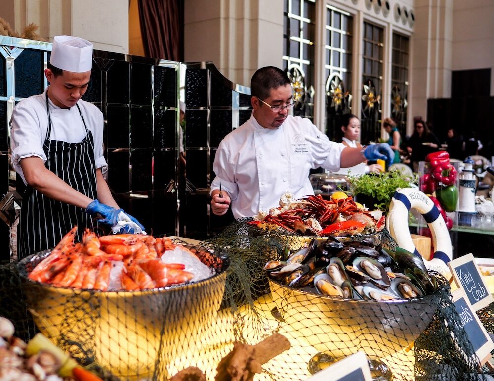 Speaking of lobsters, like most people, the first thing to catch our attention on the buffet line is the Seafood Bar. Boasting Brittany oysters from France and Fanny Bay oysters from Canada, seafood lovers can look forward to fresh bulots (also known as whelks), clams, poached prawns, mussels, and king crab. Love uni? Check out the live station that plates up sea urchin and crab meat with lobster bisque, and topped with caviar.