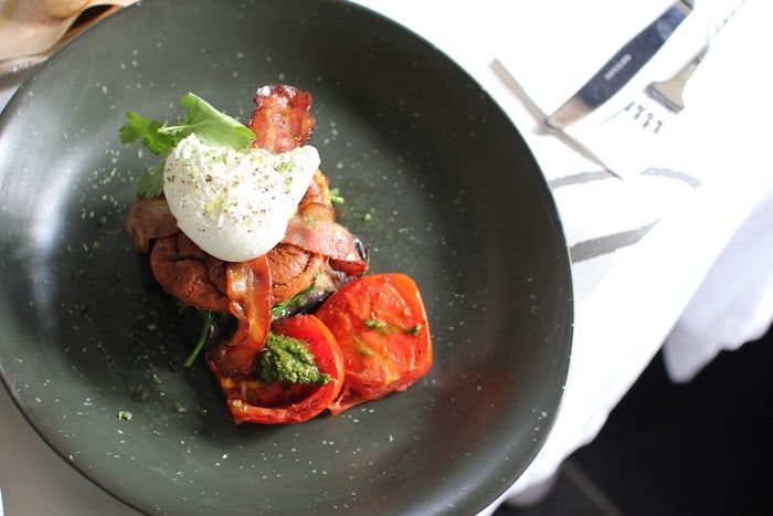The breakfast soufflé was disappointing; the smoked bacon wasn’t crispy, the double baked cheese soufflé was stodgy and soggy (though we did spend a few minutes taking photos), the wilted spinach was under seasoned but there was too much balsamic vinegar in the portobello, and the poached egg was overcooked. One thing on this plate we did enjoy eating were the pesto-topped tomatoes.