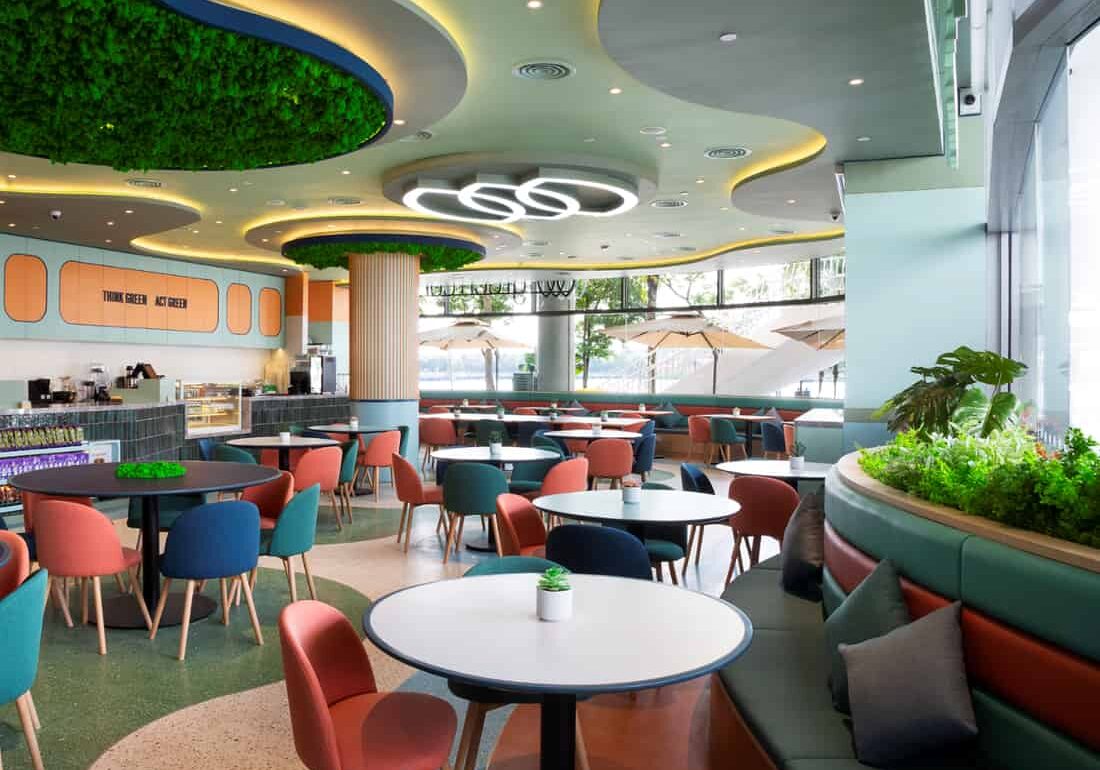 Even if you’re not vegan-curious, you might be drawn into Green Common Singapore by the space alone – a calm, airy oasis of teals, burnt oranges, and deep blues. Wall-to-wall windows flood the space with natural light, and from the ceiling sprouts a lush carpet of living moss. Just by the entrance, a wonderland of plant-based products awaits – a row of fridges fully loaded with all the meat alternatives your pantry might need.