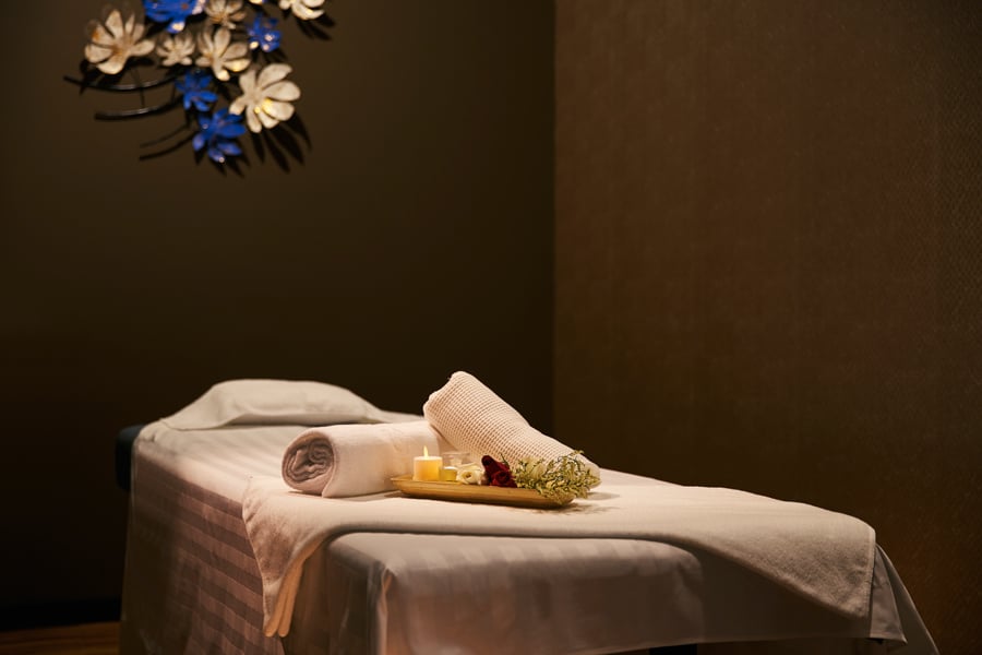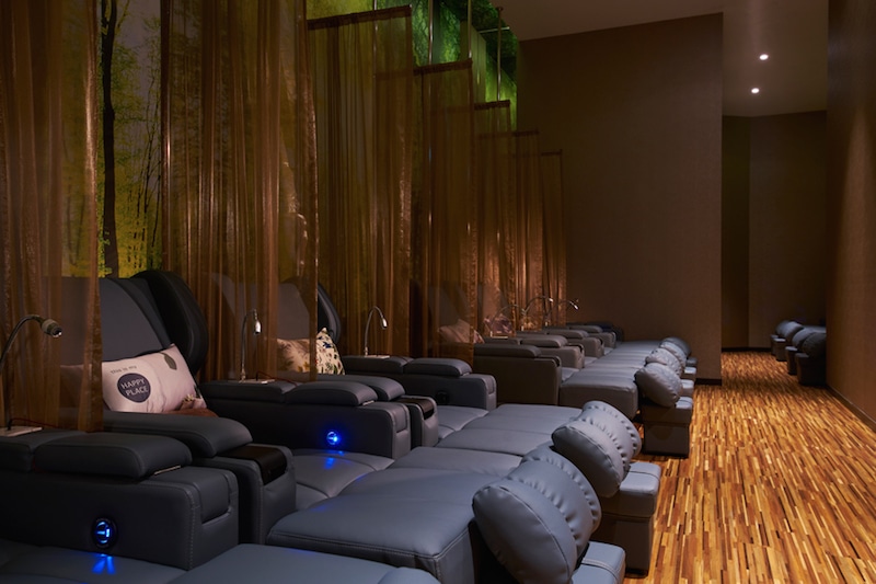 Three Jacuzzi pools filled with mineral water – one at 40 degree Celsius, one at 38 and another at 7 – just because you can. Touchscreen entertainment systems that extend from comfy couches, for your movie-watching pleasure while your foot reflexology is underway. Ambient music that changes as you move from one zone to another, so you feel utterly at ease whether you’re washing up, taking off or winding down.