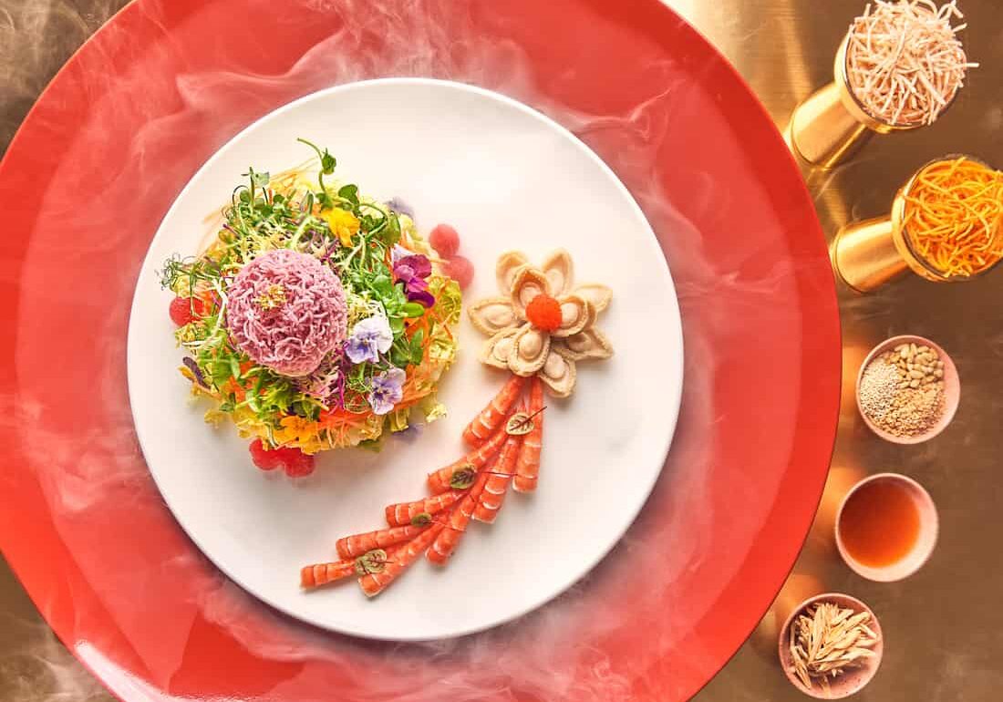 Each year, 藝 yì by Jereme Leung outdoes itself with striking yusheng creations. This year proves no different – where else could you lohei with Iberico ham, Arctic shellfish, or Japanese sweet shrimps, all exquisitely drizzled with Yunnan rose dressing? The restaurant is serving up four set menus (from S$168++ per pax) this Lunar New Year, each an artful balance of nourishment and decadence. Think Double-Boiled Fish Maw with prized morel mushrooms and nostoc pearls, Steamed Marble Goby with Green Tea Beancurd, as well as the nutrient-packed Bird’s Nest with Organic Plum Powder and Avocado Cream.