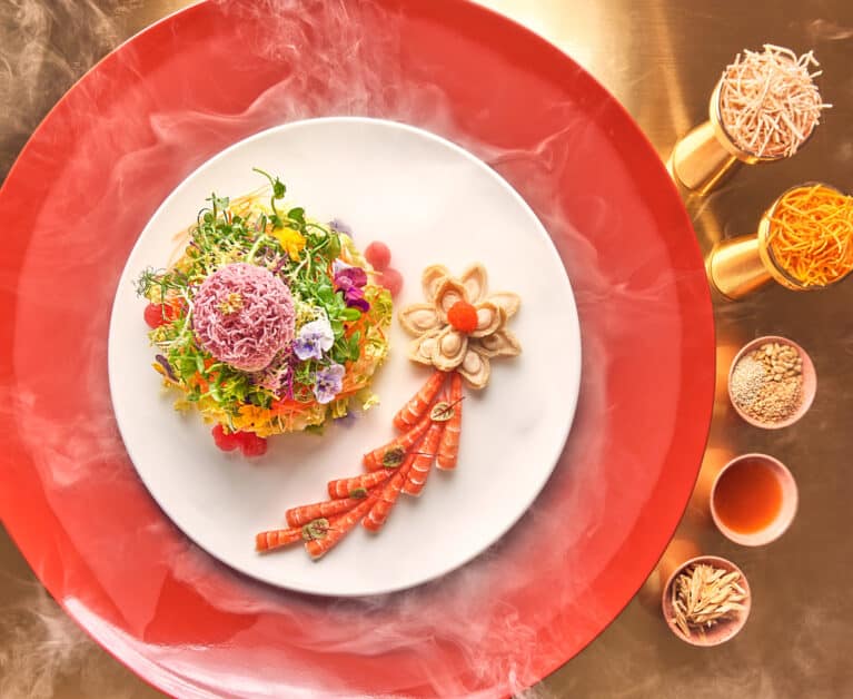Each year, 藝 yì by Jereme Leung outdoes itself with striking yusheng creations. This year proves no different – where else could you lohei with Iberico ham, Arctic shellfish, or Japanese sweet shrimps, all exquisitely drizzled with Yunnan rose dressing? The restaurant is serving up four set menus (from S$168++ per pax) this Lunar New Year, each an artful balance of nourishment and decadence. Think Double-Boiled Fish Maw with prized morel mushrooms and nostoc pearls, Steamed Marble Goby with Green Tea Beancurd, as well as the nutrient-packed Bird’s Nest with Organic Plum Powder and Avocado Cream.