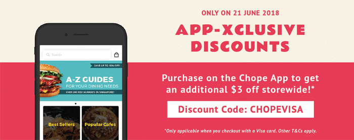 Want to enjoy an extra $3 off your voucher purchases (excluding buffets) storewide? All you need to do is pay via the Chope app with a Visa card and use the code <CHOPEVISA> on the checkout page.