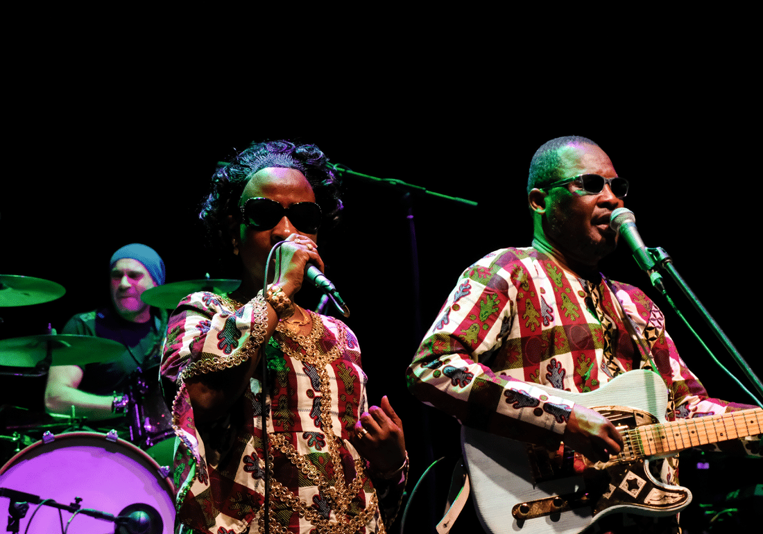 For two people who perform in complete darkness, their matching outfits are brilliant — flowing white boubou robes decorated with intricate and colourful embroidery. Amadou plays a golden guitar, soloing with funky prowess in nearly every song. His skill is most apparent in a glorious three-minute solo in Masiteladi, later blending his rich voice with Mariam’s swaggish falsettos in new songs Yiki Yassa and Bofou Safou.