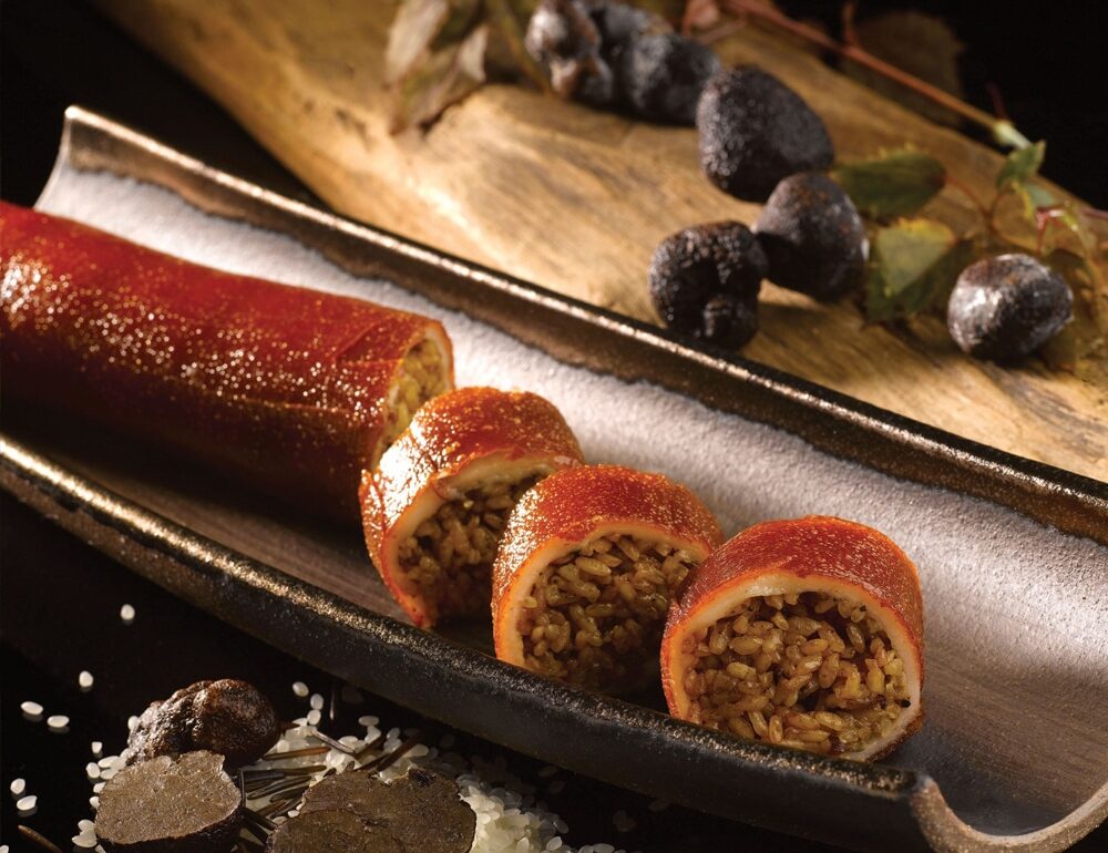 The show-stopper for us was the Roasted Baby Suckling Pig rolled with Black Truffle Pearl Rice ($20++ per pc, $168++ for half, and $328++ for whole), a roulade of crispy pig crackling wrapped around plump grains of short-grained pearl rice infused with aromatic truffle and abalone sauce. Thinking of the marvellous texture of the crackling against soft rice…yum.
