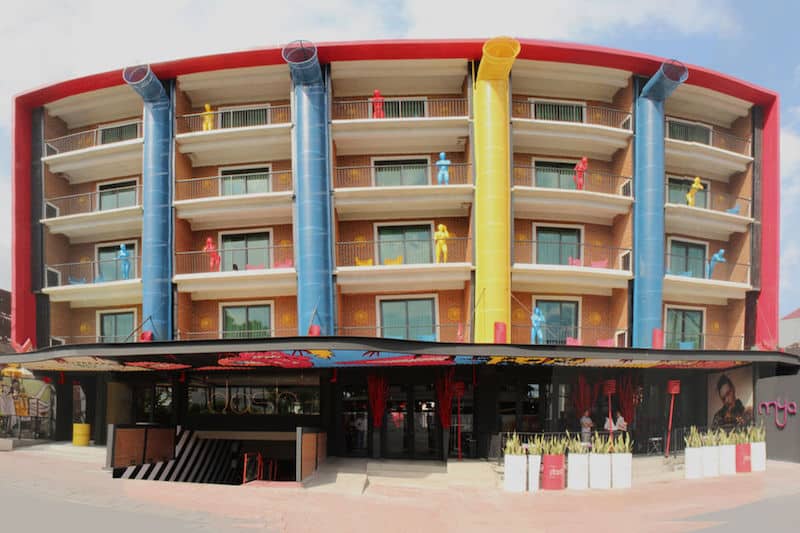 A mish mash of industrial forms, urban culture, and graffiti imparts a sort of retro-chill vibe to the hotel. Think a bright red 20-metre lap pool presided by an upside down bunny flanked with patio furniture in hues of bright pink and blue, solid red brick walls, and bedrooms chock full of funky artwork.