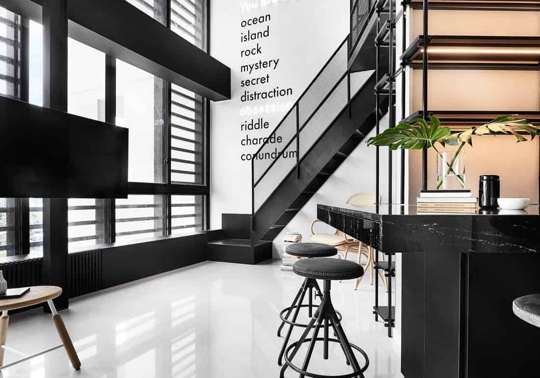Neon lights and bold monochromes make for a visual feast in 1027 Sticks, set off by double-height ceilings and an airy feel. To achieve this, the cookie-cutter layout had to be thrown out the window. “We gutted out the entire apartment,” shares Dennis Cheok, head architect and boundary-pusher at UPSTAIRS_. Tasked by newlywed owners Paul and Cheryl to craft larger spaces for entertainment, the UPSTAIRS_ team knocked down most interior walls, creating an open-plan lounge where guests can circulate freely.