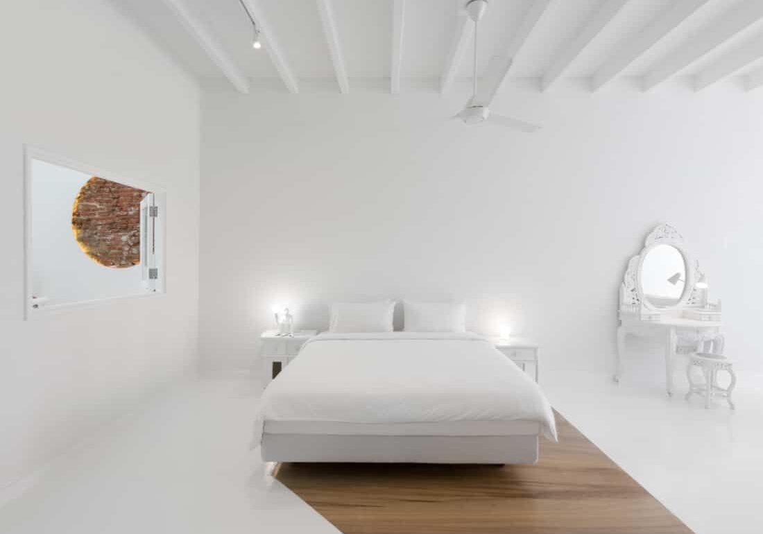 Canvas House is home to just four airy suites, designed for short-term rentals of three to 12 months. From the 300-sq-ft Ivory Suite to the 620-sq-ft Alabaster Suite, each option is sleek, equipped with an en-suite bathroom, and of course, snowy white. Only the patches of floor beneath the beds are ‘peeled away’ to reveal aged timber – cleverly angled such that the beds seem to be casting a shadow of the past upon the present. No doubt there’ll be colour in whatever form that guests bring to their rooms as well – painting upon this blank canvas their own stories.