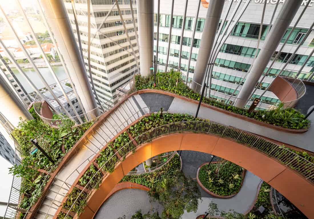 Designed by the award-winning Bjarke Ingels Group in collaboration with Carlo Ratti Associati, CapitaSpring’s sleek aluminum façade undulates with pin-striped fins. From the outside, its sinuous curves unfurl to reveal glimpses into the sky-high greenery within. And there’s a lot of greenery to peek at – over 80,000 plants from more than 130 species, each selected for their ability to thrive in Singapore’s tropical climate. It’s no wonder that this biophilic building has already clinched the Building and Construction Authority’s Green Mark Platinum Award.