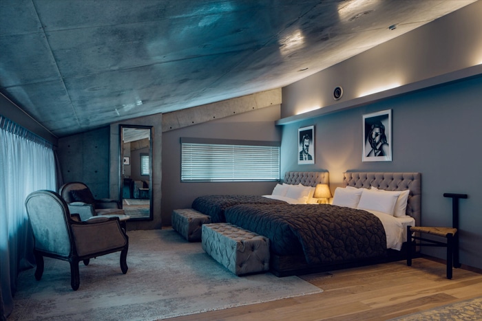 This narrow five-storey structure comes designed by Seiichiro Takeuchi, the architect behind projects such as the private house-meets-hotel Machiya Hotel. Starting from a facade of glass and concrete, walk in to be greeted by a monochrome painting by Tomoo Gokita hanging behind the stark grey front desk — it’s manned by hip young staff in collarless black shirts, so you know this is a cool place.