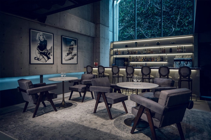 A wall of glass above the bar frames a vertical garden alongside bold photographs by Nobuyoshi Araki