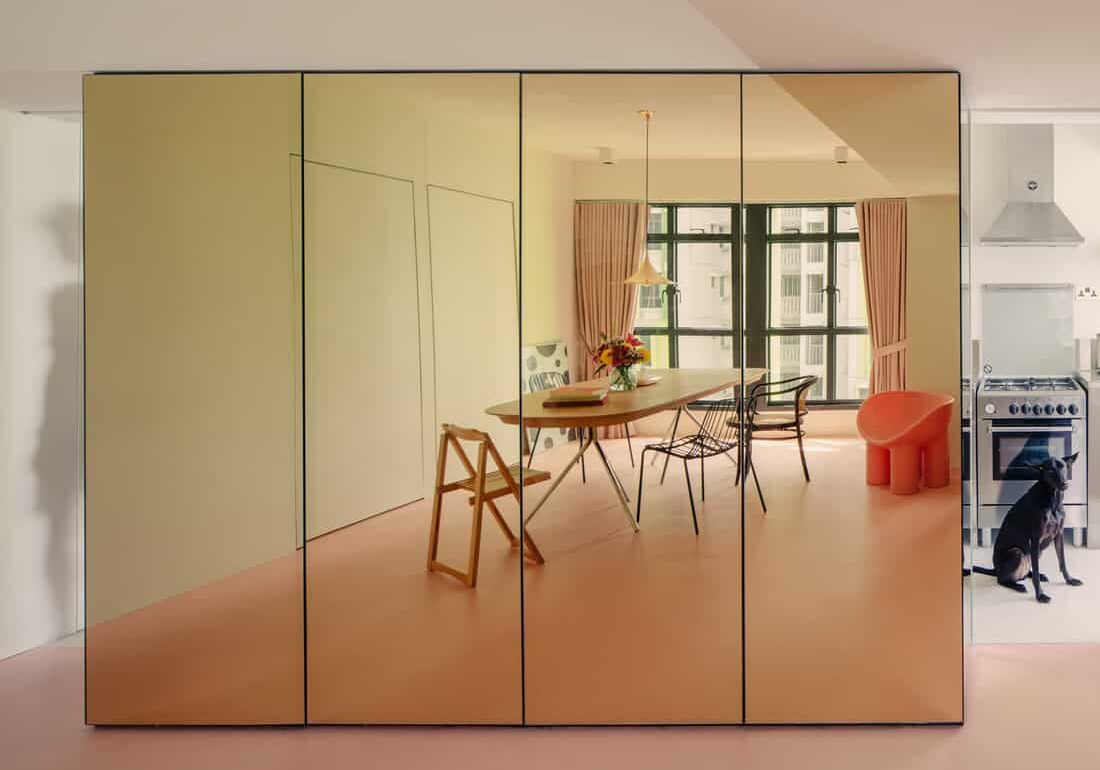 Its purpose is first of all functional – dividing the living room and kitchen, while sleekly concealing any clutter behind its reflective doors. The result, however, is undeniably aesthetic. “It serves as an object of attention, diverting one’s gaze from the lack of views outside the apartment to the space within,” Jun Nan explains. Whereas storage tends to be tucked away in corners to enhance space, the mirrored pod gives the illusion of doubling the space while commanding pride of place.