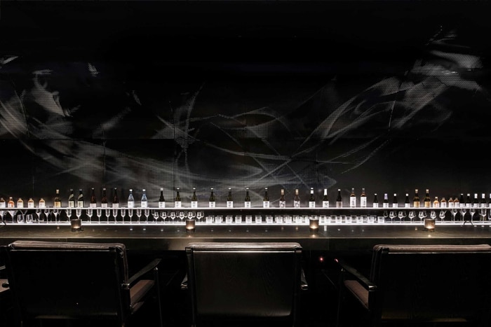 Then, there’s the whisky bar the likes of which you have never seen: double layers of pierced steel planking artfully amplified by two argent mirrors on each side, and a dance of light and patterns on the back wall creating a foggy scene. It’s a pretty sight indeed.