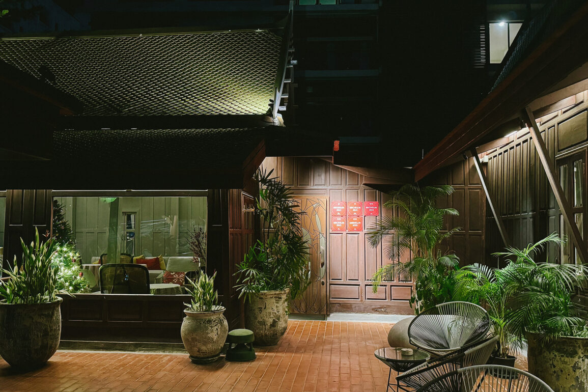 Night view of Gaa Bangkok’s courtyard with traditional wooden architecture and lush greenery.