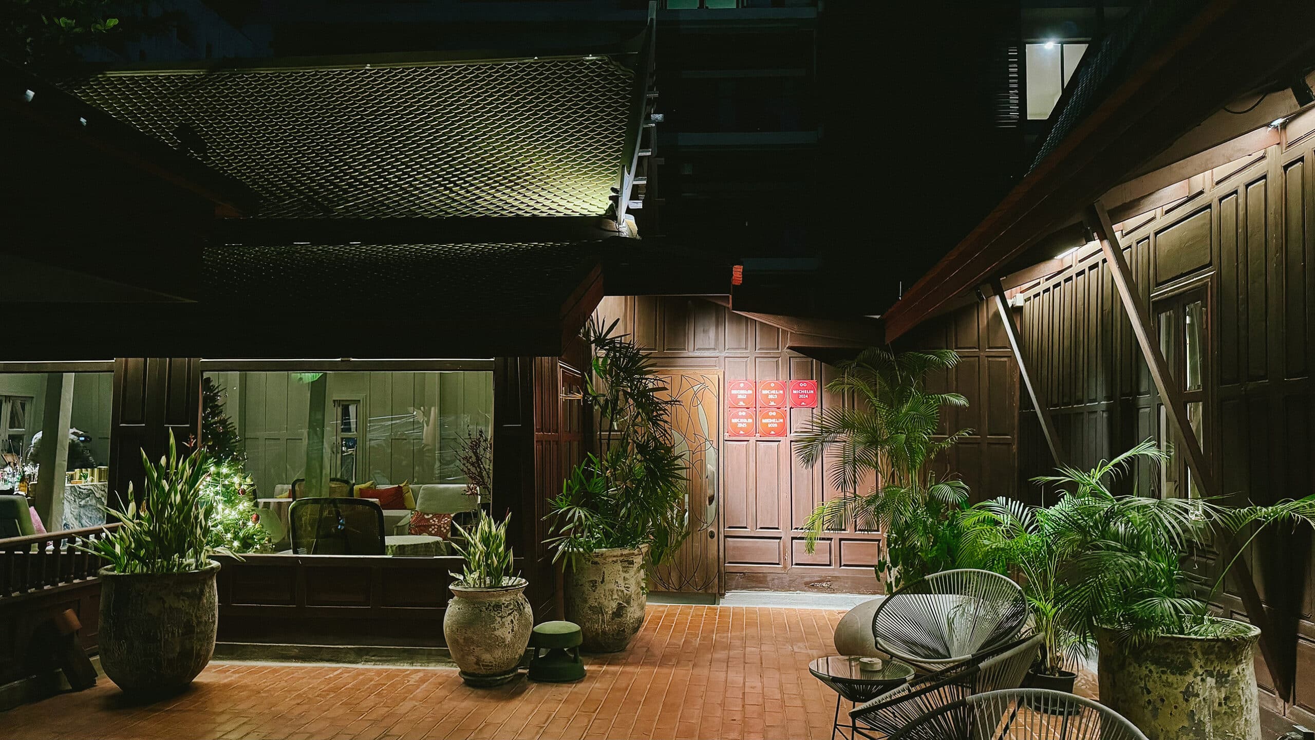 From the street, the first glimpse is of a traditional wooden Thai house partially hidden behind foliage. A small sign bearing the restaurant’s name marks the entrance. As we step off the road and onto the property, the shift in atmosphere is immediate. Textures become the first thing we notice. Greenery, timber, and the patterned herringbone tiles beneath our feet.