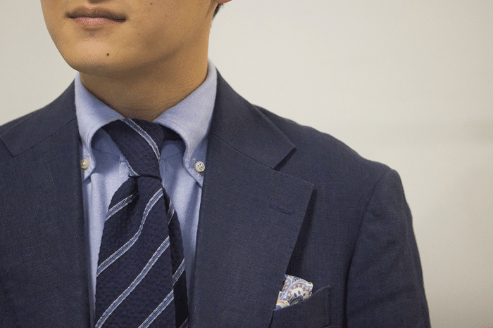 While we were on a buying trip in Japan four years ago, we found a very unique roll of striped seersucker in navy and blue and made them into ties. There was only enough for 18 ties, and it sold out almost immediately. I kept one for myself and it’s my absolute favourite. I only managed to find the weaver of the fabric a few months back, and we have placed an order for more of this fabric that should be arriving in June this year.