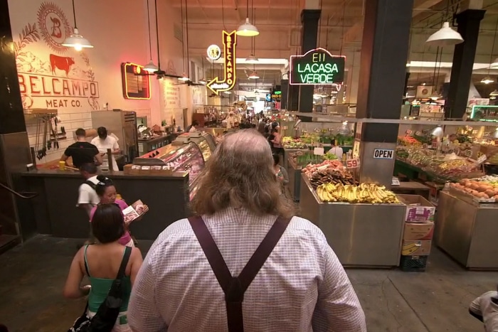 City of Gold takes you through a sprinkling of his daily life: a work meeting with his editor (his wife Laurie Ochoa), conversations with his two children, and him writing on his laptop at the dining room table. These little nuggets alternate with gliding shots of large supermarkets and old cinemas as Gold monologues about himself. He talks about his upbringing in a family of activists and about his difficulty meeting deadlines at times. There are also interviews with his associates who pay tribute to his quirks and genius, including David Chang and Andrew Zimmern, who points out that Gold avoids the “all-too-common cultural sin of contempt prior to investigation” in his writing.