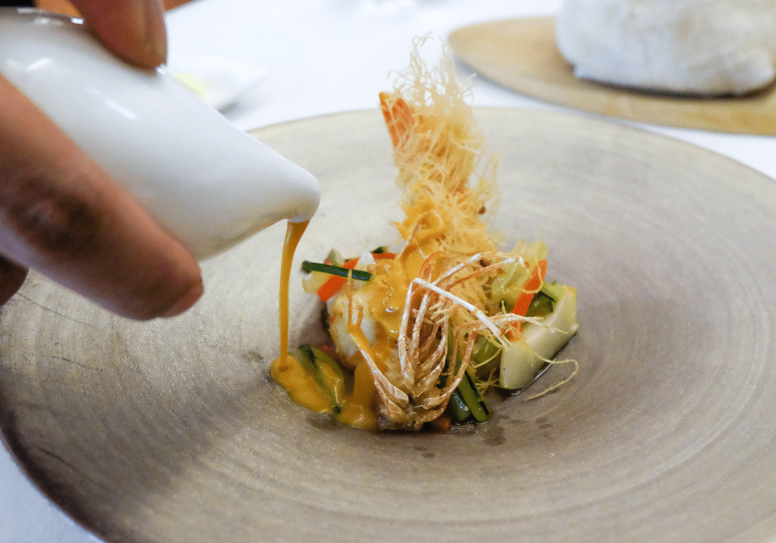 There’s the “Kadayif” – angel prawn wrapped with shredded Middle Eastern filo pastry to produce a crunchy bite, reminiscent of the crispy vermicelli often found in zi char spots. An accompanying laksa sauce is a clear influence of local flavours, presenting a beautiful tangy sweet bouquet with hints of coconut.