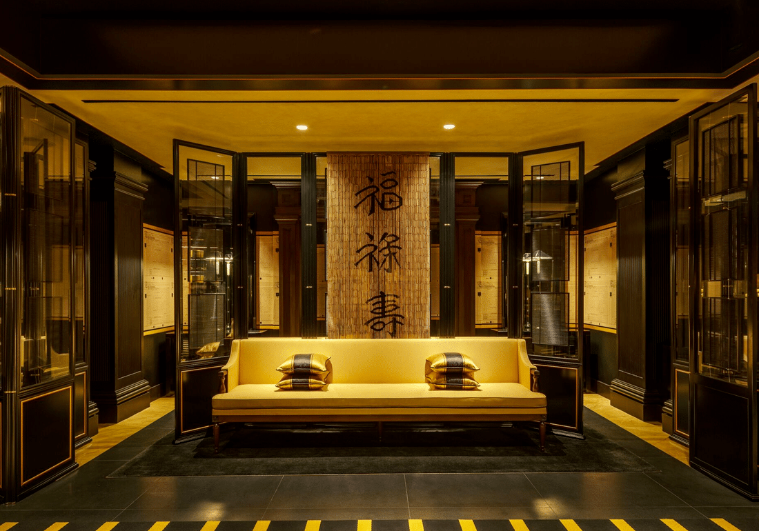 In harmony with its rich history, there is a fascinating mix of Chinese, Malay, and European elements that see everything from Chinese porcelain friezes to Malay timber fretwork, neo-classical lion head motifs, Portuguese shutters, and Corinthian pilasters. As for the dominating colour palette? Strong hues of black, gold, and yellow blending seamlessly with oriental screens and calligraphy wallpaper from Anouska’s personal collection.
