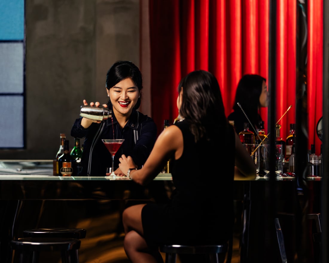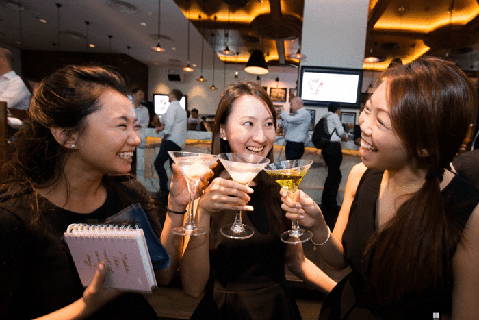 Friends enjoying cocktails and gourmet bar bites at COMO Cuisine, a luxury happy hour destination in Orchard Singapore.