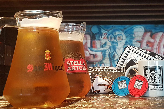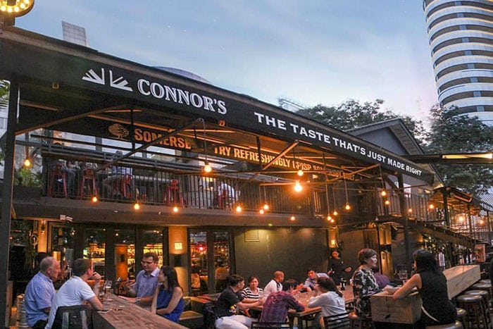 Friends toasting with pints of beer at Crossroads Café, Orchard Road’s go-to happy hour spot in Singapore.