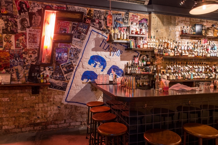 Interior of Offtrack Singapore, a retro-inspired vinyl bar and restaurant with mid-century decor, disco balls, graphic art, and ambient lighting, eclectic dining and nightlife venue.