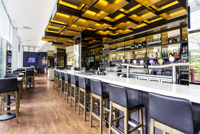 The Bar at Morton’s Singapore with stylish architecture, home to happy hour classics and filet mignon sandwiches.