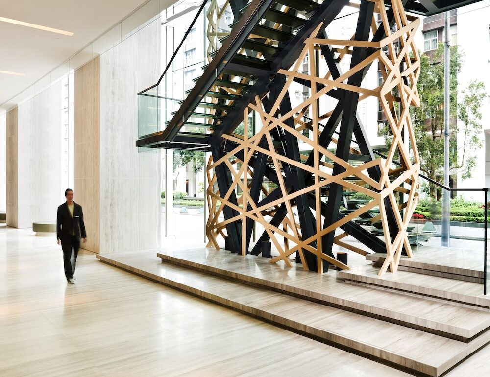 Eight stops from Central MTR on the Island Line, EAST is situated right outside the station and is within walking distance to office complexes Taikoo Place and Cityplaza, making it perfect for business and leisure travellers alike. Upon arrival, it’s clear that this lifestyle hotel designed by architect and interior design company Studio CL3 is a well balanced one. The use of natural materials – think limestone, bamboo, and wood – and nature-inspired art pieces create a comfortable space for the well-being of the mind and body. Art here is even functional; the bamboo staircase resembling a bird’s nest by artist Kum Chi Keung connects the ground floor lobby to FEAST, the hotel’s all-day dining restaurant on level two.