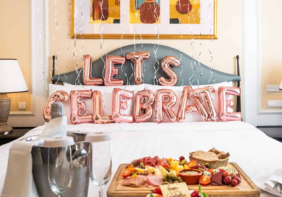 Entering the well-stocked room, we were greeted with a bottle of Prosecco, a huge bouquet, and a generous Charcuterie board complete with dried fruits, nuts, and crackers, which definitely set the tone for the celebration. To top it off, pink, gold, and polka-dotted balloons adorned the bedroom ceiling, along with golden balloons screaming “Happy Birthday” on the bed (words are customisable, by the way). And if you think that’s all, they’ve even prepared a birthday cake. Because no birthday is complete without a cake, this certainly put us in the mood for a joyous celebration.