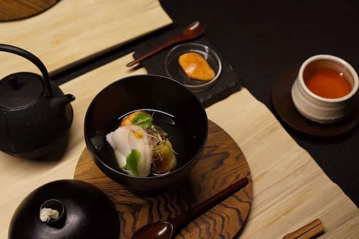 We started with a duo of amuse bouche – a crunchy charcoal cracker inlaid with fish bones and a nicely battered ball of cod liver. If you still remember the history of the neighbourhood, you’d be interested to know that the drum-like vessel on which they served the snacks were partially made from old wood that used to be part of a daimyo residence. Talk about history on a plate! This was followed by the first course – a light yet flavourful akamutsu (rosy sea bass) consommé with seaweed.