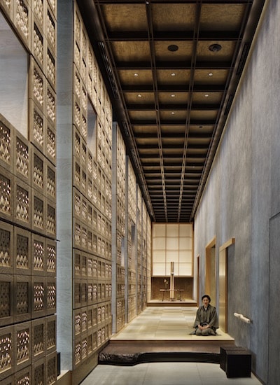 Opened less than a year ago in July 2016, the 17-storey hotel stands out from its neighbouring skyscrapers by looking like an elegant jewel box with its komon-patterned (traditionally featured on kimonos) metal lattice exterior. Contrary to its modern façade, your education in the ethos of a traditional ryokan begins upon arrival, where you remove your shoes in the lobby – they’re kept on the ground floor in lockers cleverly made to look like a detailed wall – and are led upstairs to your room. This process is both an invitation for guests to treat the entire building as if it were their home, as well as a method of preventing the uninvited from entering the premises, thus highlighting the exclusivity of the property.