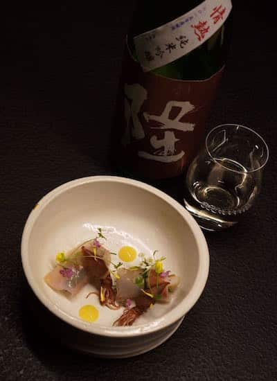 We started with a duo of amuse bouche – a crunchy charcoal cracker inlaid with fish bones and a nicely battered ball of cod liver. If you still remember the history of the neighbourhood, you’d be interested to know that the drum-like vessel on which they served the snacks were partially made from old wood that used to be part of a daimyo residence. Talk about history on a plate! This was followed by the first course – a light yet flavourful akamutsu (rosy sea bass) consommé with seaweed.