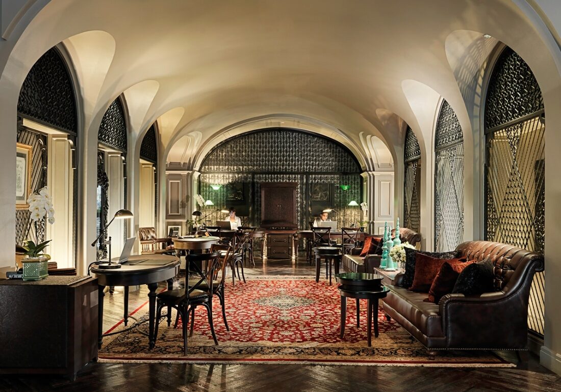 Part of Sofitel’s high-end MGallery collection, Hotel Muse has won countless awards for both its unique design and outstanding service. One thing we instantly notice is the gothic atmosphere in the hotel’s public spaces. The lobby is steeped in metal girders, ornate balustrade railings, and black marble. Emerald green bankers lamps are a common sight around the reception area. Even the facade wouldn’t look out of place in old Manhattan.