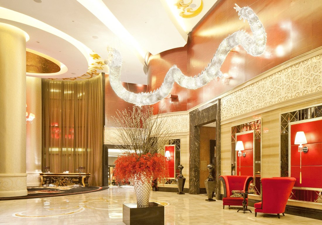 From the get go, we’re greeted with a soaring double height lobby laid out in Serpiente marble from Italy and a statement staircase that leads up to the grand ballroom. A crystal dragon made from Swarovski gems is sprawled halfway up the wall to set the tone – as if its stunning glitziness is not evident enough. The colours of the hotel are warm: gold, red, and cream adorn the building’s sofas, carpets, and pillars, and there are oriental motifs and patterns as far as the eye can see.